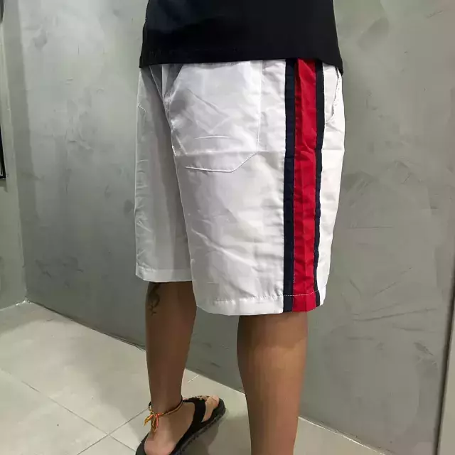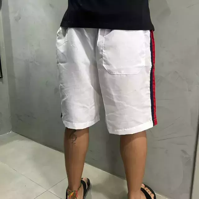 Possui dois bolsos na parte frontal e um bolso na parte traseira com detalhe de etiqueta bordada.